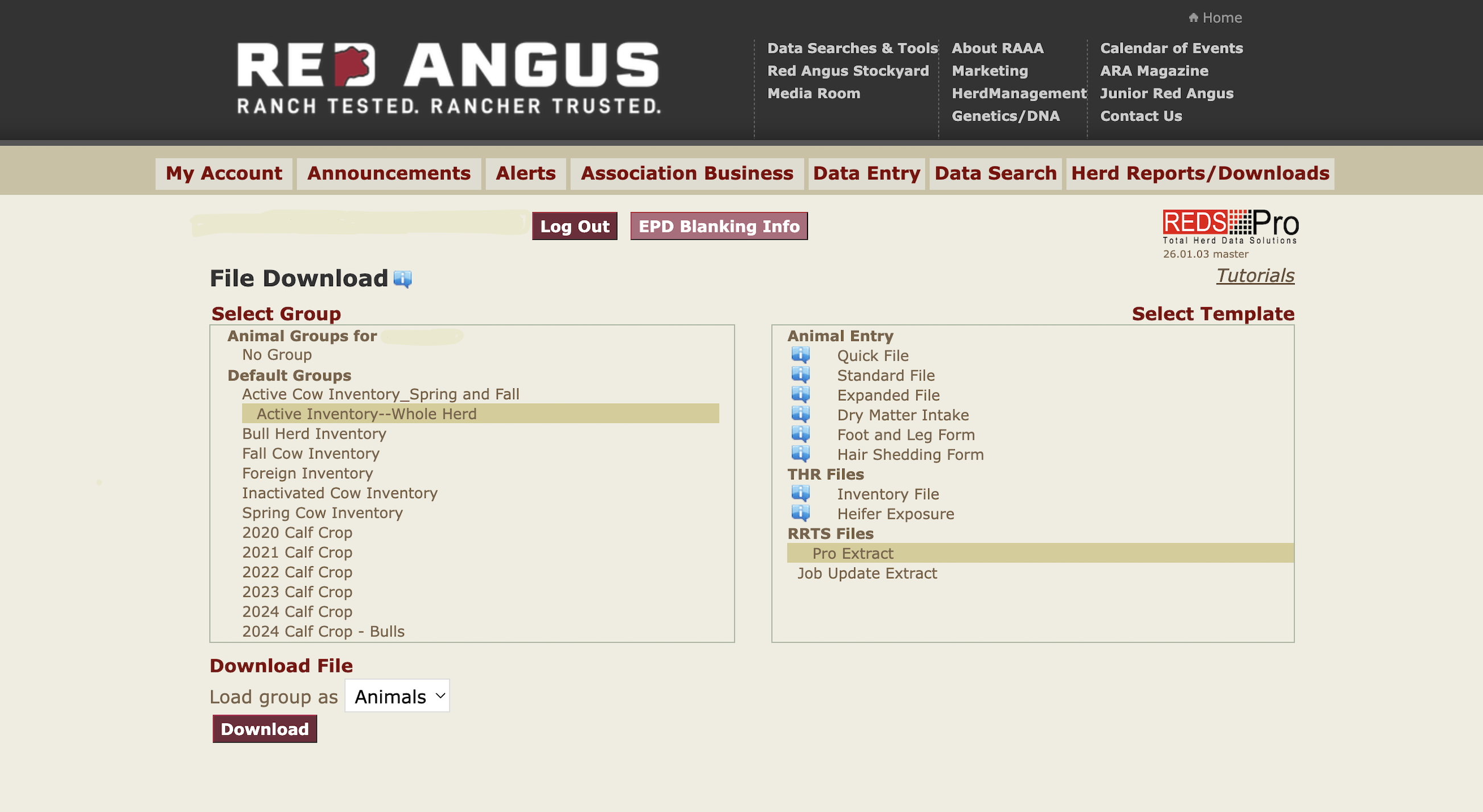 - Log in as a member and go to the Herd Reports/Downloads tab and select File Download: