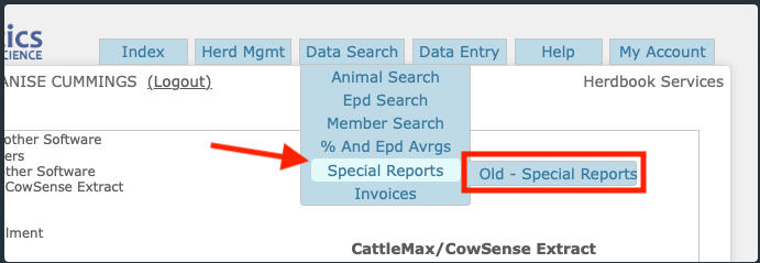 - Go to “Data Search” then hover over “Special Reports”, and then click on "Old - Special Reports." Please note that if the "Old - Special Reports" option is not selected, the file will be incorrectly named and in the wrong format for import.