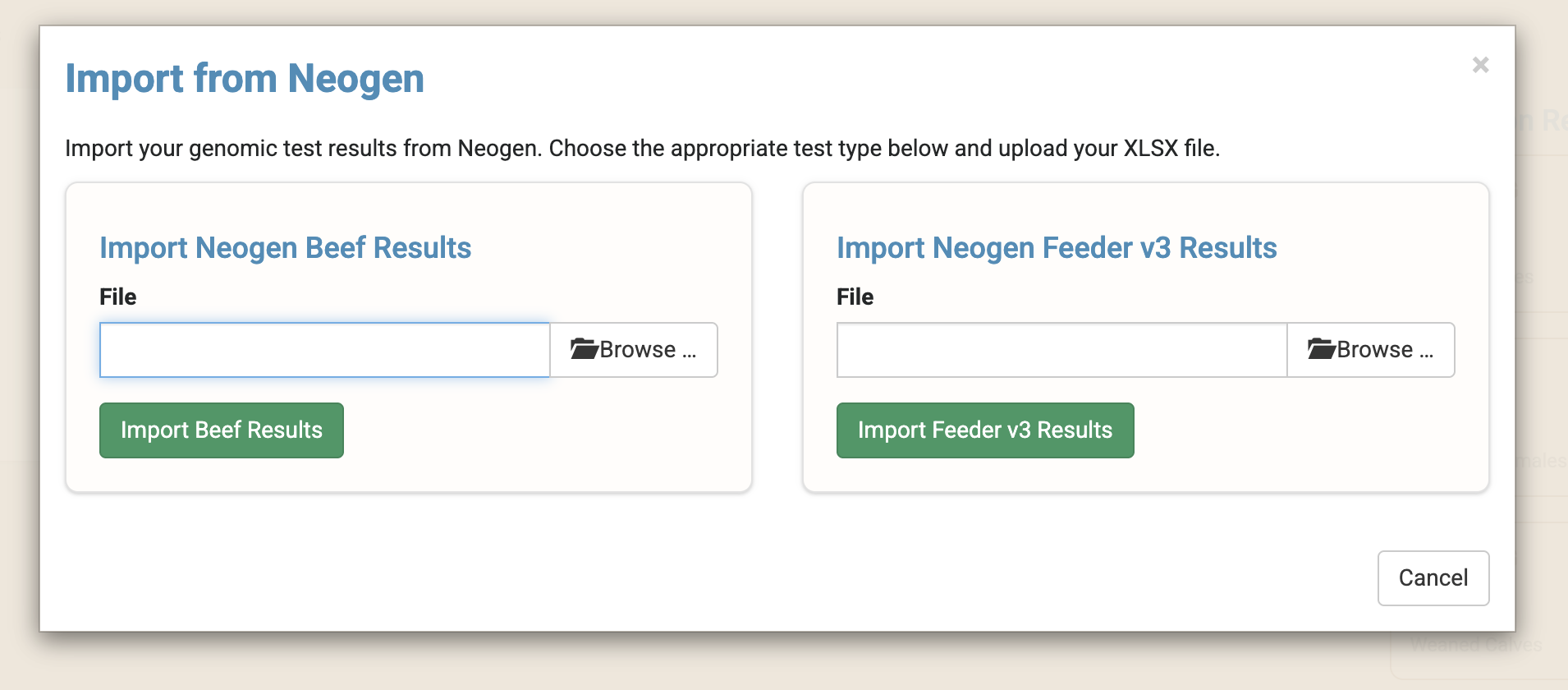 To import the Neogen data: from the Dashboard, go to Cattle, Import Data, and choose Neogen from the dropdown list. You can browse and attach your Beef or Feeder v3 files exactly as they were sent from Neogen. Click Import Results and wait for your confirmation email. The Neogen data will be located on the DNA tab of the animal's profile.